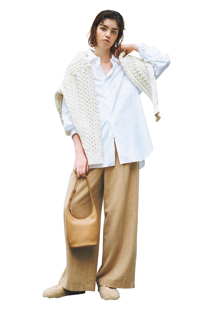 肩に無造作にかけるだけで、ぬくもりをもたらす肉厚なケーブルニットの実力。ニットとシャツのニュアンスの異なる色みゆえに、まとめた白にほどよい抑揚が生まれて脱・無難をかなえてくれる。