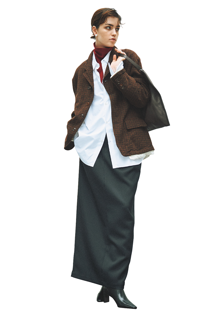 白シャツは着まわし。ブラウンジャケット 74,800円/ジェーンスミス(アダム エ ロペ) 中に着た赤タートルネックニット(メンズ) 3,990円/UNIQLO 黒タックスカート 28,380円/Oblada(シンチ) イヤリング 13,200円/アビステ バッグ 42,900円/MOFIORA(アマン) ロングブーツ 13,590円/ZARA(ザラ カスタマーサービス)