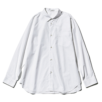 ベーシックなドレスシャツを着方のアレンジがしやすいオーバーサイズに。加えて、アウターに干渉しにくい、ゆるさが適度な丈と身ごろ。ツヤと立体感が生まれる高密度なコットン素材は、きちんとはもちろん無造作に着てもキレイめに整う。小ぶりなえりでレイヤードしても首まわりがもたつかない。