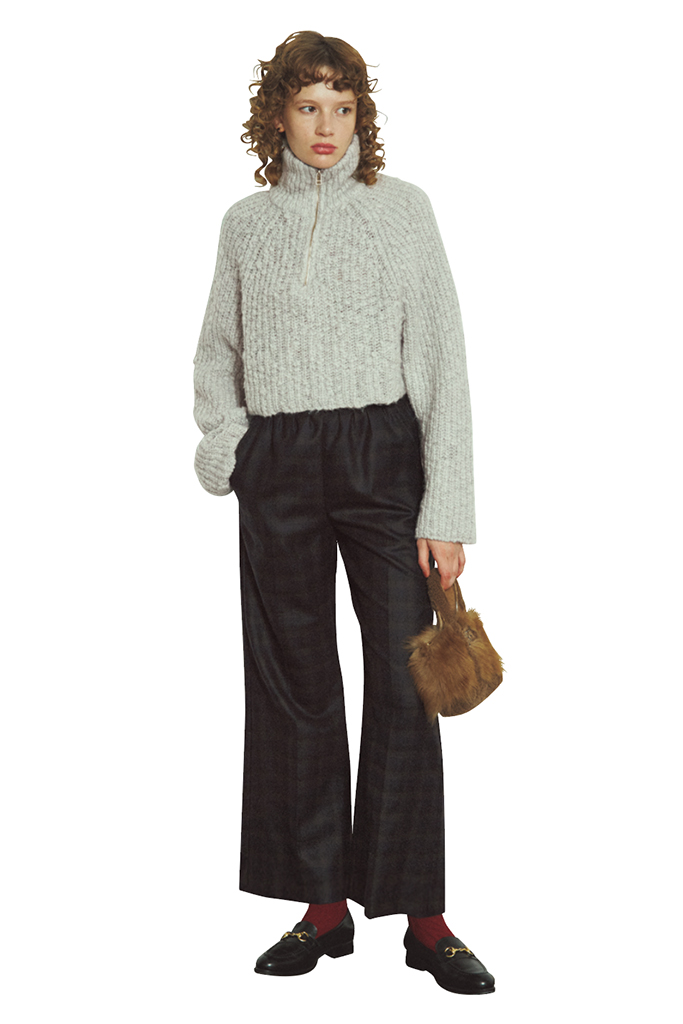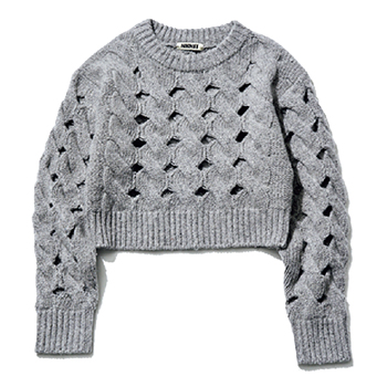 グレーホールドケーブルニット 28,600円/NKNIT ケーブル柄に開いた穴が、肉厚なニットにモードな抜け感をもたらす。硬めのウール素材を選ぶことでシルエットが崩れず、輪郭はシャープなまま。インナーで遊べるのも魅力。
