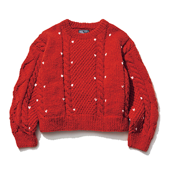 赤ニット 26,400円/Sea Room lynn(シールームリン神宮前店) メンズライクな地厚ケーブルに、コンパクトな丈感と散りばめられたハートで大人の可愛げを。強い色だからこそ、これくらいの遊び心でハズすのがちょうどいい。