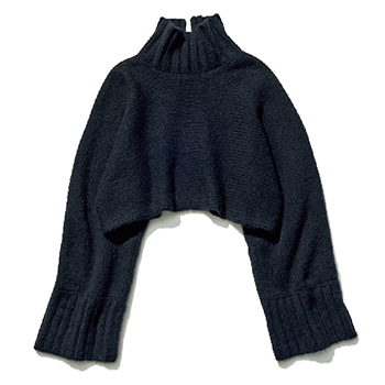 ブラックタートルニット 71,500円/LE PHIL(LE PHIL NEWoMan 新宿店) ストイックな黒タートルを、大胆なクロップド丈で刷新。たっぷりとゆとりを持たせた袖と、潔い短丈とのコントラストが、上半身を逆説的に華奢に見せてくれる。