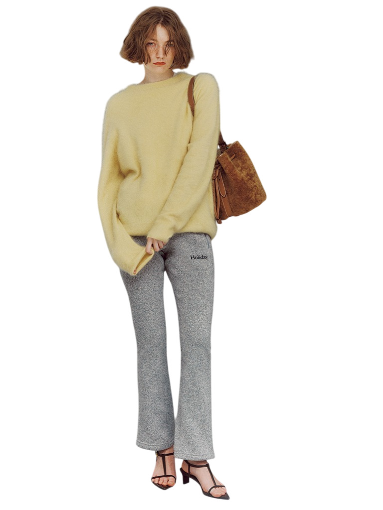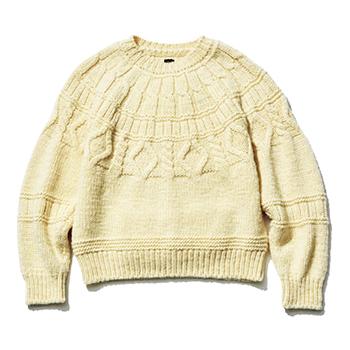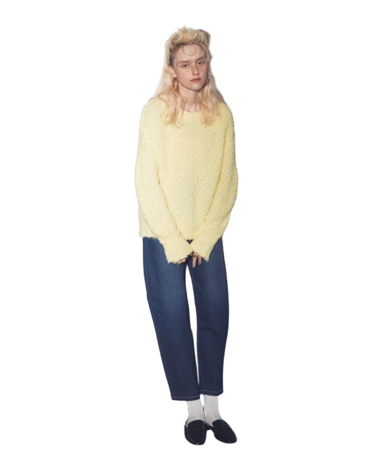 ボリュームニットにありがちなもたつき感を、軽やかな色で解決。ブークレの立体的な風合いで、ゆったりとしたデニムと合わせたときも奥行きが出る。華やかなのに派手に見えないエクリュ寄りのイエローは、デニムに限らずベーシックカラーのボトムにも好相性。