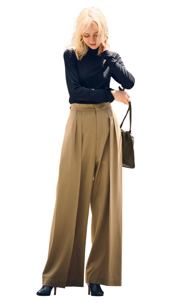 まず欲しいのはごくシンプルで美しいシルエットの1着。ピチッっとしないけど、ボディラインをキレイに見せてくれる程よい伸縮性で、余計な装飾もない上質な黒リブニット。キレイな直線を維持できるハリをそなえたフランネル素材と、くっきりと入ったセンタープレスが相まったパンツを合わせてスマートな仕上がりに。