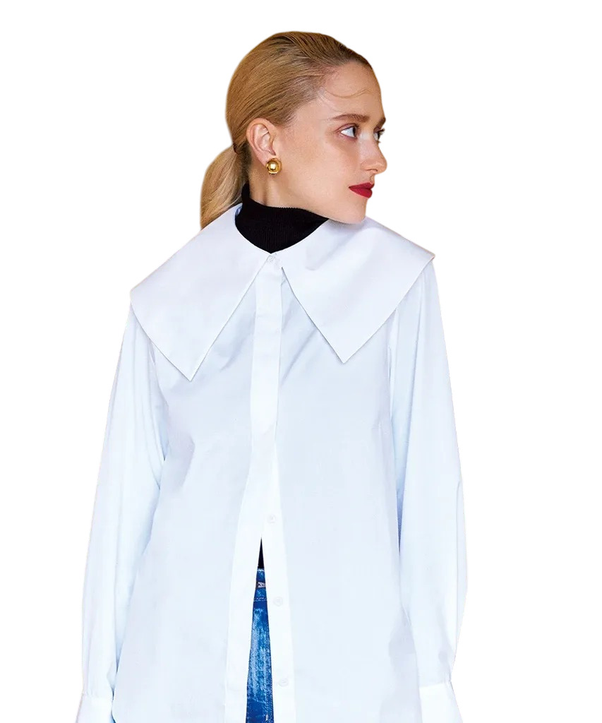 首元から黒タートルをのぞかせて、白ブラウスを「大人びた甘さ」に。大きなえりの甘さを抑えるためにも黒タートルの緊張感が有効。