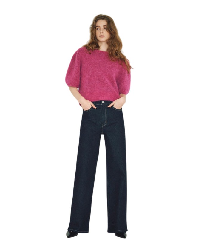 愛らしいパフスリーブが凜とする、ベリーピンクの大人な色づき。こっくりとした重厚感のあるピンクと、アルパカ混のフォギーな風合い。そしてボリューミィなそでのふくらみ。それだけで充分華やかなので、シンプルにデニムを合わせました。ニットのドレッシーな雰囲気が生きるよう、デニムでもキレイめに振れるインディゴの直線的なワイドをセレクト。