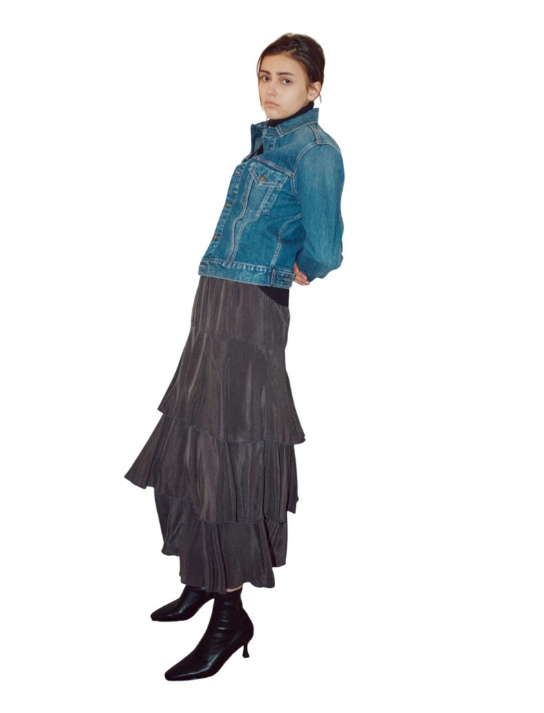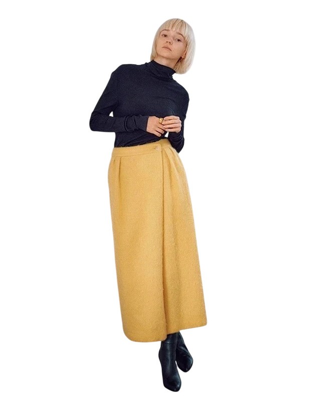 イエローの発色をならすように、ふわふわとした風合いが目を引くスカート。肌に吸いつくような薄手のタートルと一緒なら、もったりすることなく、むしろ明暗つけた配色による強さが宿る。トップスとスカート、厚みも色も極端に差をつけることでウエストラインの印象もシャープに。