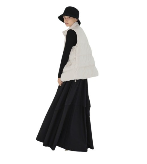 キレイな服と、そのハズしに役立つダウンベスト。タイトなニットとフレアスカートの好感度の高い黒に、立体感をもたらす白ダウン。ときにカジュアルすぎるダウンも、白っぽいベージュとのモノトーン軸なら洗練された印象。タイトな黒のタートル&広がる黒でつなげて、Aラインのワンピース風に仕立てたコーディネートに1枚、重ねるだけでちょうどいいリラックスムード。