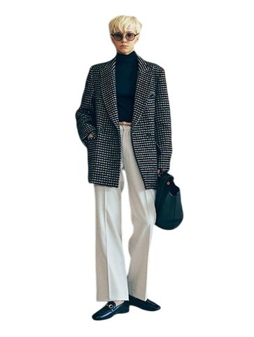 ジャケット、スラックス、タートルにローファー。アイテム自体はすべて定番、だけどサイズ感や柄、素材感などすべてメンズライクな服でのコーディネートをレパートリーのひとつに。どこかやぼったさのあるおじさん風のチェックと味のあるビットつきローファー。さっぱりとしたモノトーンの上下でも、その2つがクラシカルなムードに引き寄せてくれる。