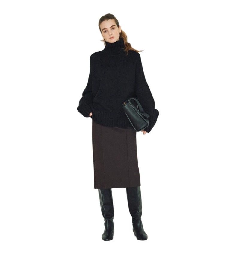 着慣れた黒ニットが見違える、すっぽり埋もれるオーバーサイズ。たっぷりとした首元に加えて、身ごろもそでもゆったり&長め。ボリューミィなサイジングが視線を引きつけるぶん、ボトムの主張が和らぐので、新鮮味のあるひざ丈のタイトスカートにトライ。