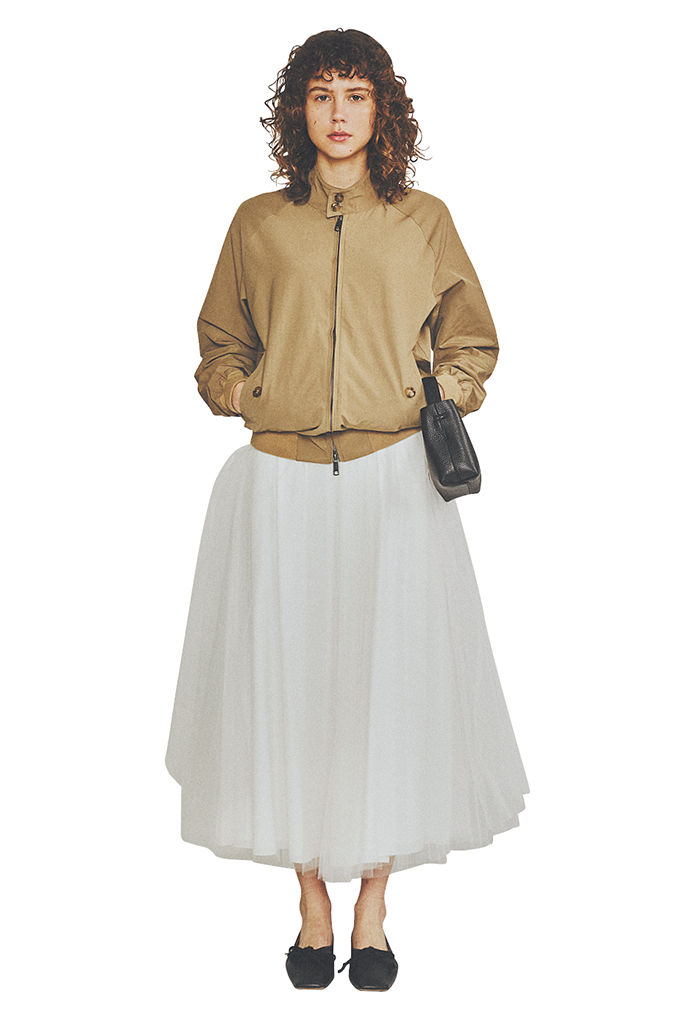 端正なハイネックに、トップス的に使える短め丈。ハンサムにもカジュアルにもふれる紳士なブルゾンは、あらゆるテイストを許容する名脇役。前を閉めてハイネックシャツっぽくアレンジ。着方でいっそうハンサムに寄せると、直球でフェミニンなチュールスカートを大人っぽく落とし込める。ブルゾンにハリ感があることで、シャープな印象もキープ。