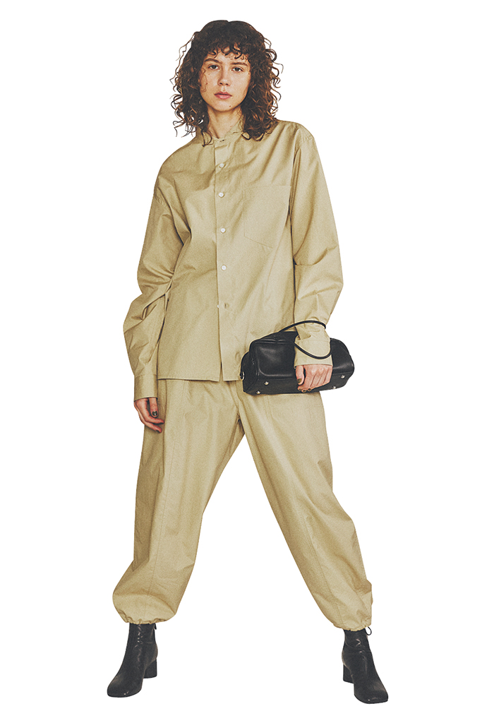 合わせるシャツもメンズを選び、ルーズなシルエットをひとつなぎ。浅いベージュだからやんちゃな雰囲気に転ばず、クリーンな表情を維持。ウエスト&足首をきゅっと引き締めつつ、ふっくらとした曲線で脚のラインを華奢見せする。ボーイッシュなギャザーパンツを利用すれば、ヒールに頼らずスタイルのいい人に。エッジが効きすぎないように薄めのベージュを選択。パンツはウエスト部分の内側にドロストを設置。