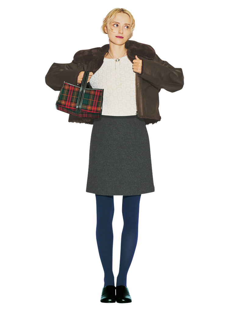 【POINT】トップスはタックイン、ジャケットもショート丈で自動的に重心を引き上げ。結果、ミニでもかえって脚が長くバランスよく。ジャケットのボア、赤+グリーンチェック柄バッグや赤リップなど、冬らしさは要所でまとめると浮かれすぎない。