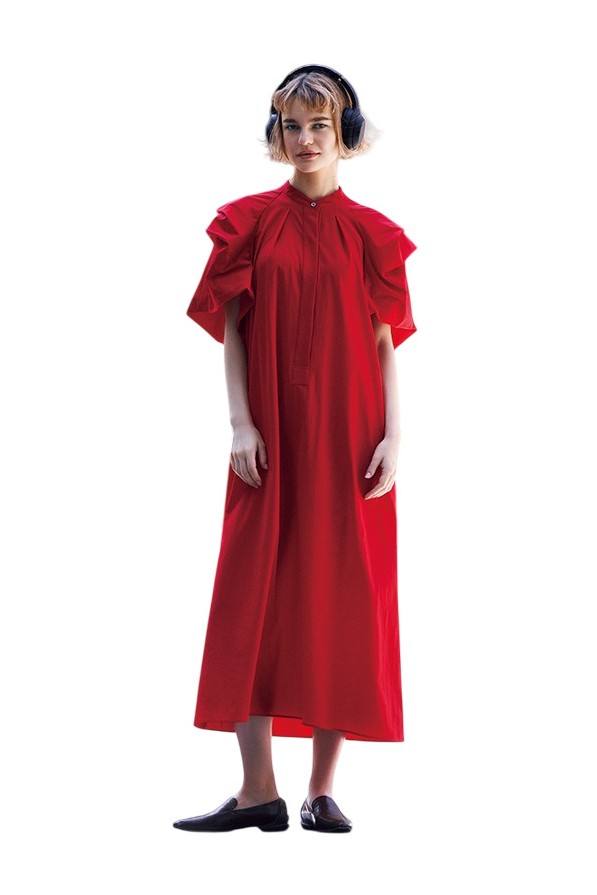 フリル見えする構築的なタックスリーブを、スポーティなナイロンで表現した糖度をおさえる好バランス。強気な赤でまとっても、質感のおかげでほどよくカジュアル。レディを象徴するドレスに相対した、メンズなローファーを無造作に。なじみのいいブラウンをセレクトすることで、赤の発色を落ち着かせて。