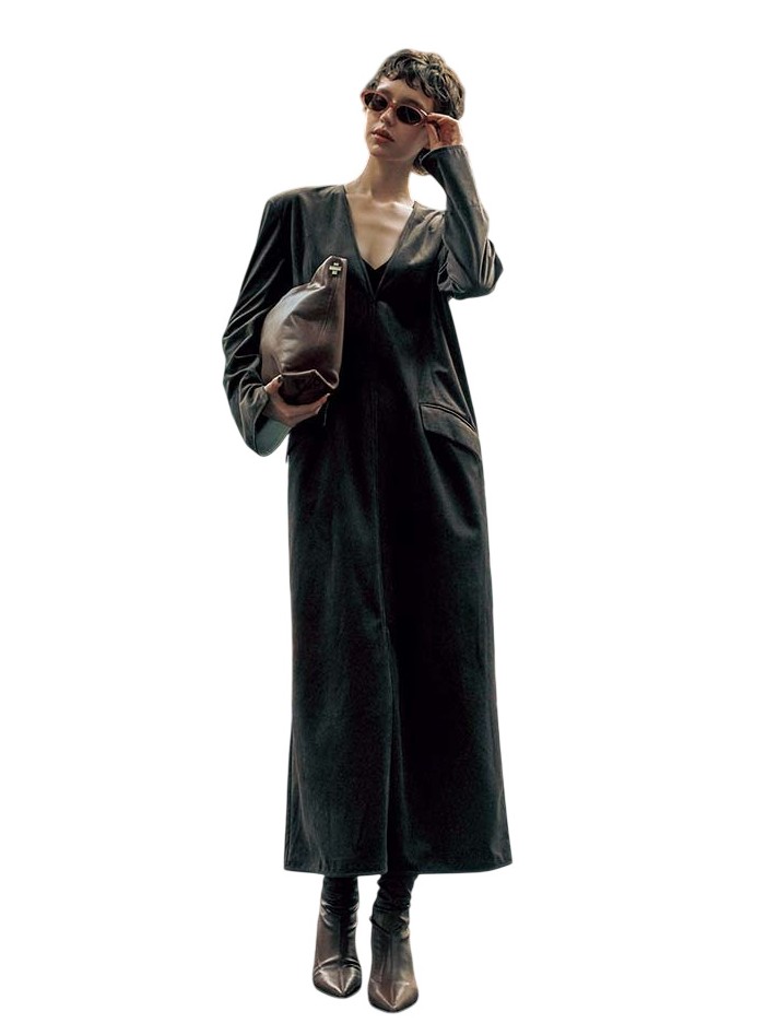 コートに頼らずともあたたかみがある、ブラウンのベロア素材。適度な光沢が、Iラインワンピースのエレガントな雰囲気を底上げ。隙のないシルエットに意表をつく、深いVネックの潔さ。両サイドにほどこされた大きなポケットは、スマホやリップをちょっと入れておくのに便利。