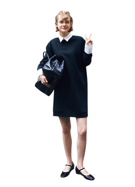 正統派な1枚にメリージェーンの甘さをひとさじ。必然的に重心をひき上げるミニ丈と、バイカラーのえりで視線を上げるダブルの効能。丈が短いぶんデコルテを隠した隙のなさが、ミニなのにスマートな理由の1つ。白ソックスを合わせたくなるところを、引き算するのがスタイリッシュ。