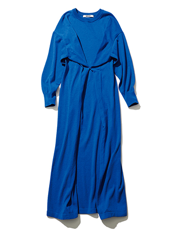 ニットワンピース 14,993円/NAVYNAVY まろやかなニットが澄んだ青のインパクトを緩和。ウエストのボタンを留めればメリハリのあるXライン、はずせばリラクシーなボックスシルエットに変化。その日の気分で緊張感を調整できる、賢い2通りの着方を実装。