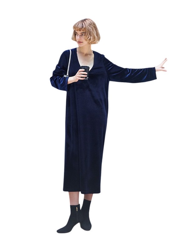 小物で飾らずともベロアの質感で品性をキープ。深いVをともなった美形なIラインドレスは、素材をベロアに置きかえることでクラシカルな深みを加えて。光の角度によって表情が変わるネイビーがシック。Vネックにインナーを仕込まず、鎖骨を飾りにする算段。ワンピースのすそとショートブーツの間から肌を見せ、ドレッシーすぎを回避。