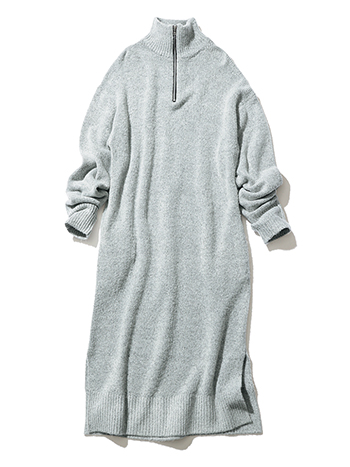 ニットワンピース 33,000円/ケラウズランブラ(ジャック・オブ・オール・トレーズ プレスルーム) 思わず触れたくなるラフな編み地のニットを、胸元のメタルジップで辛口に引き締め。ジップを上まで閉めればストイックに、開ければポロ襟風にアレンジして抜け感を。見た目の温かさと、都会的なシャープさ。相反する要素を1つにまとめた、バランス感覚に優れた1枚。