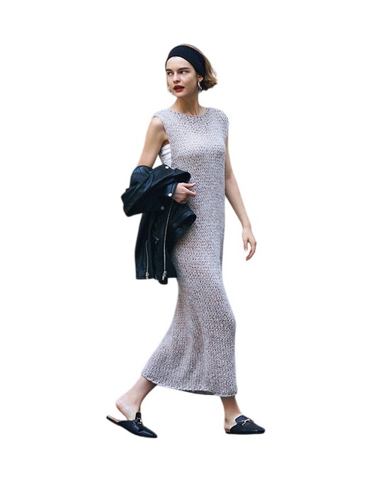 顔まわりの小物でキャッチーに促して。体へのほどよいフィット感とノースリーブから伸びる腕が、想像力をかき立てるニット素材のあざとさ。つつましきベージュなら、露骨なセクシーさとは無縁。