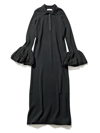 ニットワンピース 16,940円/GALLEST(ワールド プレスインフォメーション) 複数のシルバーボタンつきでエッジをプラス。視線を集める「袖口」のボリューム感。あえてアクセサリーをつけずに楽しみたくなる立体的なフリルが、仕草まで優雅に見せる。