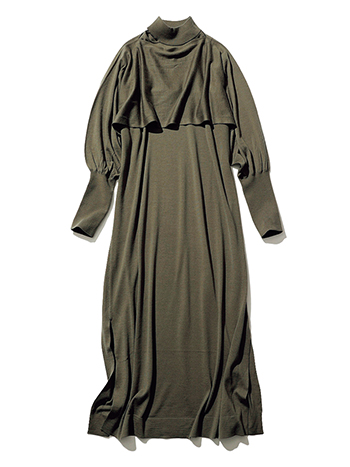 ニットワンピース 69,300円/サヴィル サヴィ 取りはずし可能なショルダーウォーマーとワンピースのセットアップ。あえてウォーマーを重ねることで生まれる鎖骨部分の肌見せが、ほっこりしがちな冬のニットスタイルにキレを生む。