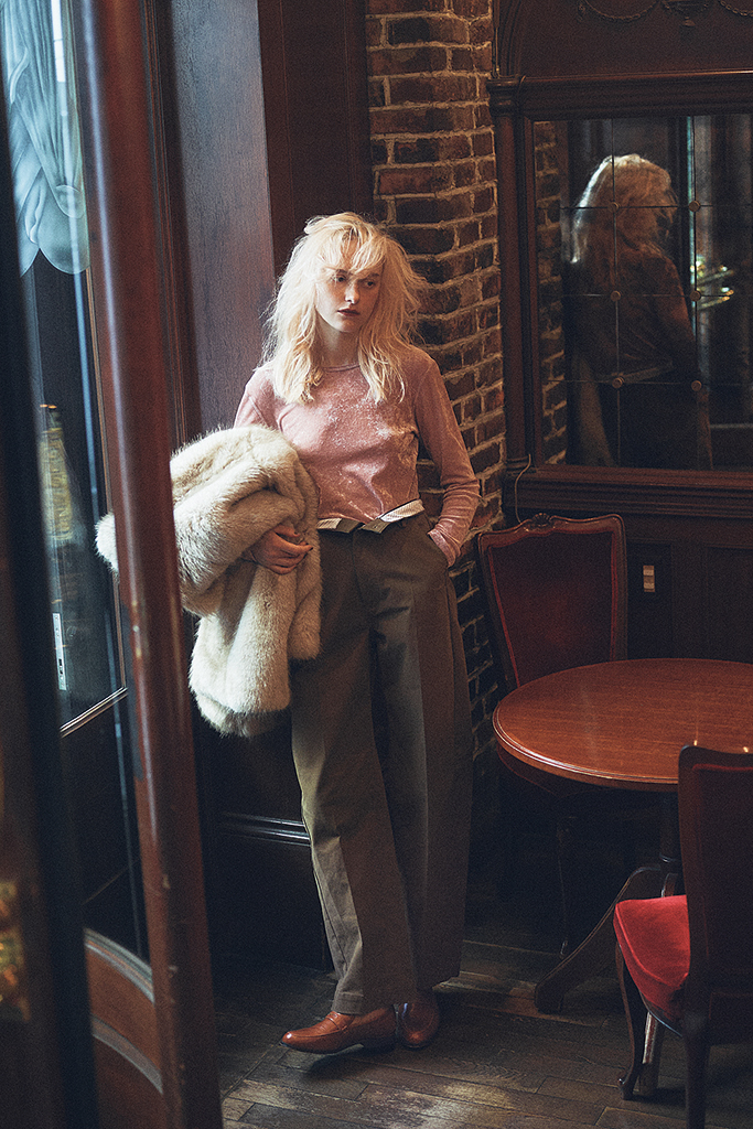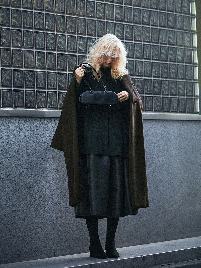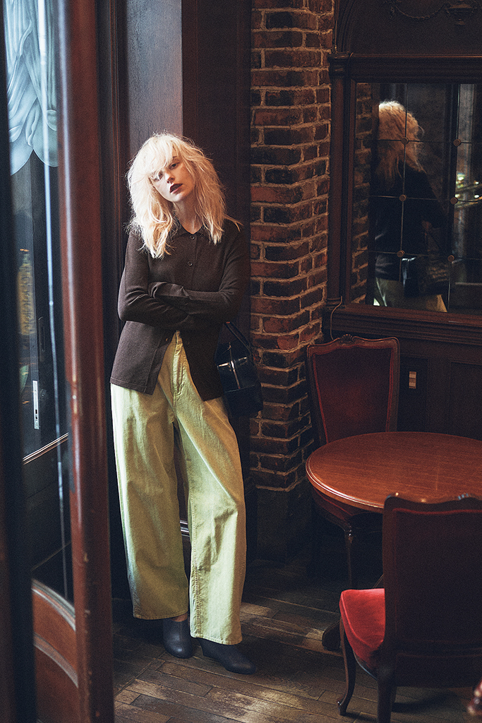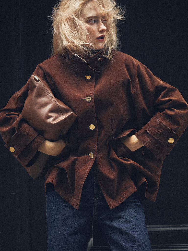 旬はブルゾンをはじめとしたスポーティなムード。装いに親しみをもたらす一方でボーイッシュにも転びがちなアイテムは、ブラウンの品格を借りて都会的にシフト。素材はコーデュロイ。スタンドカラーや金ボタンなど、クラシックな要素が入るとより端正な面持ちに。