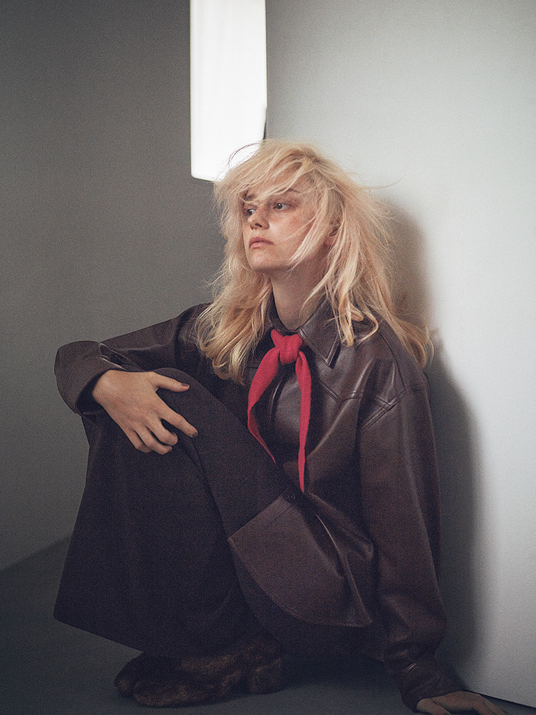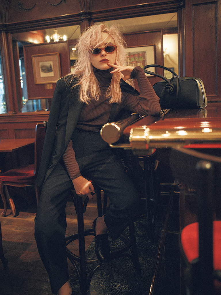 重厚感のある色により、着込まずとも温度感を上げられるのもブラウンのよさ。あたたかみのある色とのギャップで引き立つ色香。