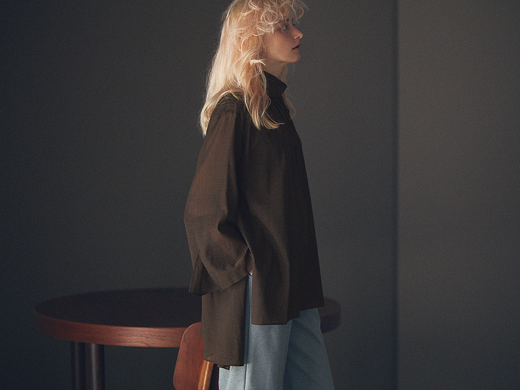 かすかな透け感による素肌のニュアンスで、クラシカルなブラウスをモダンな印象に。ブラウンとも相性がいいグレーの渋色パンツで甘さを微調整。
