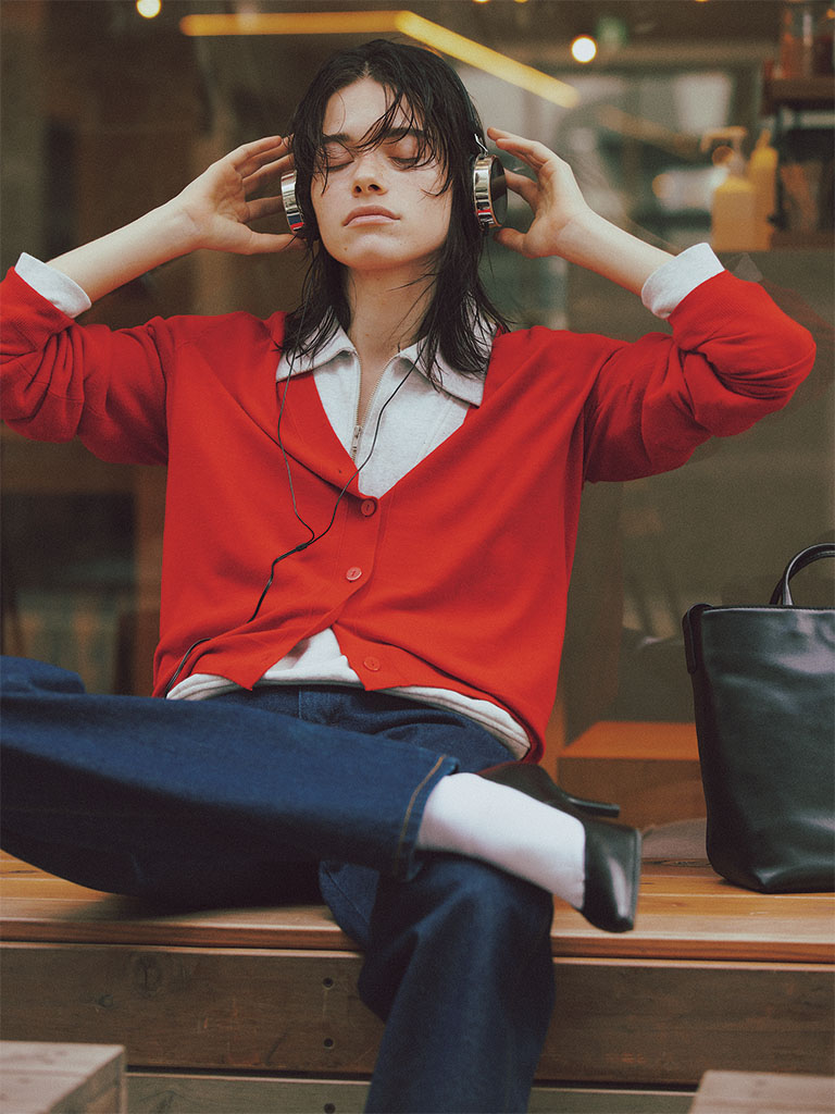スウェットの上に重ねてももたつきにくい、フラットな編み目かつVネック。薄手のしなやかな素材感なら、鮮やかな赤の発色も和んでとっつきやすいあんばいに。丈も身ごろもゆるすぎず、コートの中からのぞかせる差し色としても優秀。