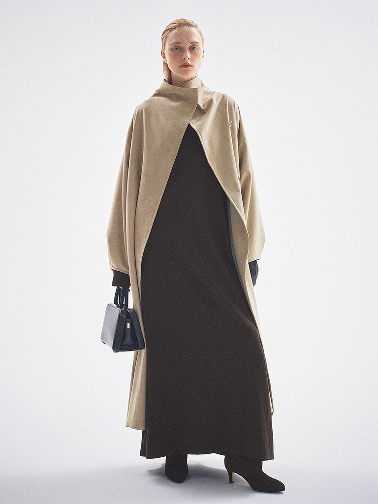 デザインやディティールを極力省き、たっぷりとしたシルエットが際立つたたずまい。エコスエード素材がもつ適度な重みが、ロングでもひらつかない、優美なドレープ感を表現。スタンドカラーのボタン位置をセンターからわずかにずらすことで、前立てラインが斜めに。すべて閉じて着ても単調に見えない、シンプルに差がつく1着。