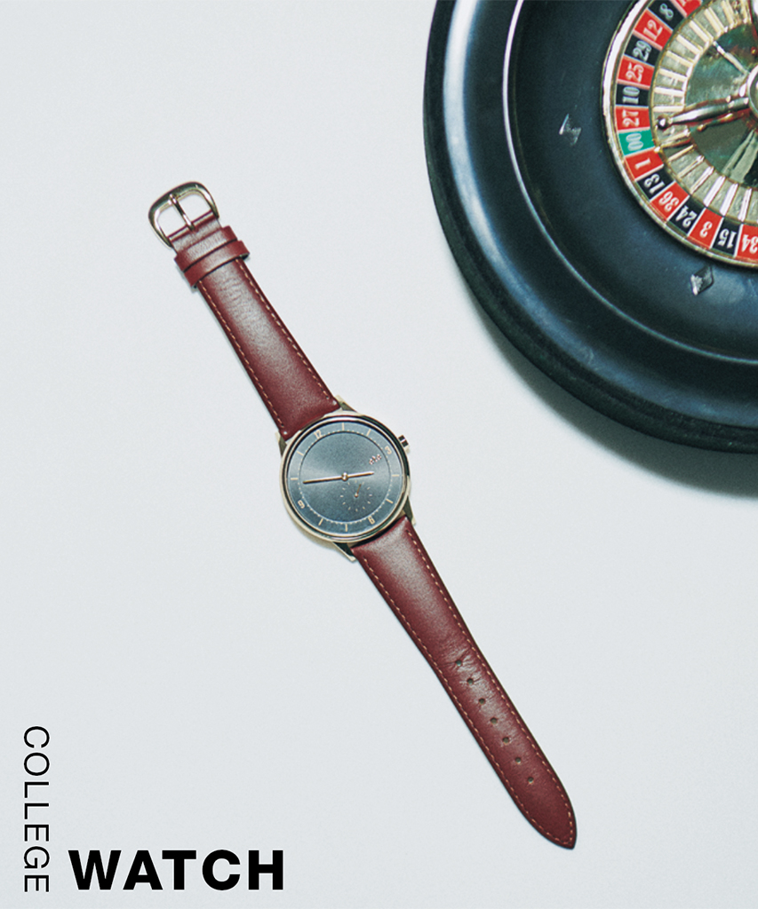 時計 22,000円/ete フォーマルだけどカジュアルにも使える、赤みブラウンのバンド。文字盤は黒、ベゼルはゴールドのバランスが、ミニマルなデザインにジュエリーのような適度な強さをプラス。厚みひかえめでトップスに左右されず使いやすい。