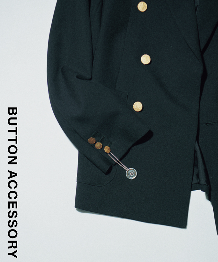 ボタンチャーム 83,600円/アクセップ(ロンハーマン) ジャケット 69,300円/オブラダ(シンチ) 服につけるジュエリー。ベルトループやボタンホールをさりげなく飾るワンポイントに。