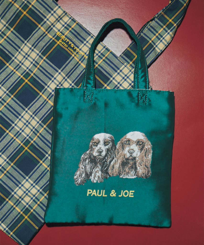 (右)dogバッグ(24×20) 5,280円/ポール & ジョー アクセソワ(ワグ インク) 光沢のあるグリーンと愛らしいイラストのギャップが可愛いトートバッグ。 (左)チェックバッグ(36.5×33.5) 4,400円/ビューティー&ユース(ユナイテッドアローズ 渋谷スクランブルスクエア店) グリーンのほかにネイビー、イエローもあるタータンチェックは浮かずに使えるひかえめな差し色としても重宝。