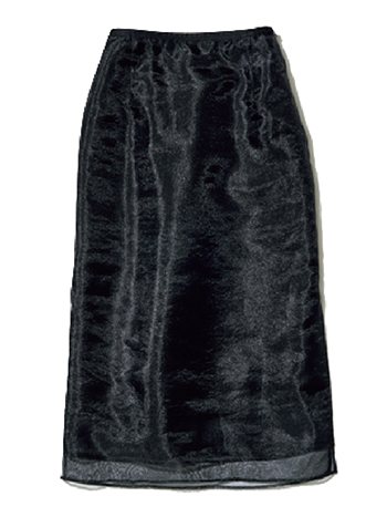 シアー素材も、黒のタイトスカートなら甘さ控えめでモードな表情に。丈を変えて二重に重ねることで、透け感に奥行きが生まれ、いやらしくならずに上品に着地。重くなりがちな冬の黒コーデに、軽やかなリズムを生む1枚。