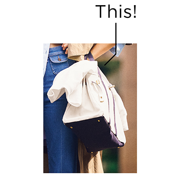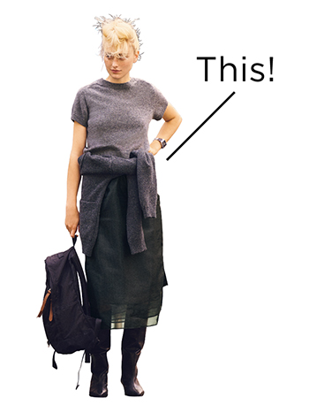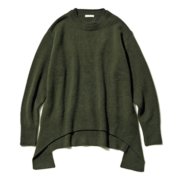首元のレイヤード風デザインと、サイドの切り替え。凝ったディテールのおかげで、テクニックいらずで「おしゃれな人」になれる。カーキの辛口な色みが、デザインの甘さをほどよく中和。