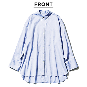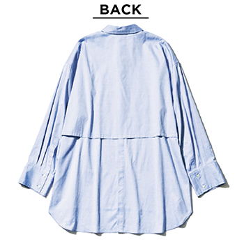 ニットのインナーとして、あるいは1枚で。ほっこり感を調整できるのは、このパリッとしたブルーの清涼感があってこそ。後ろのデザインでさりげない個性を主張し、シンプルだけでは終わらせない「技あり」な1枚。
