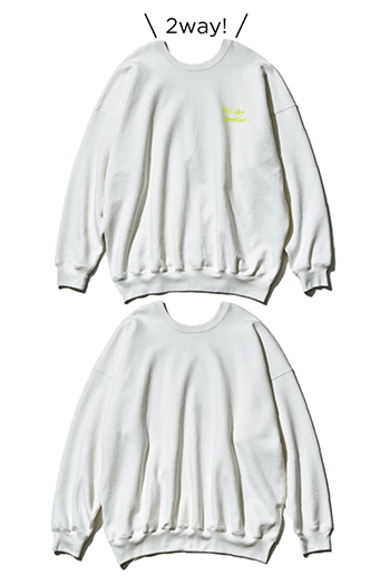 前後どちらでも着られる2WAY仕様で、その日の気分に合わせて首元の開き具合を調整可能。単なる白スエットで終わらない理由は、胸元のネオンロゴのアクセント。ルーズなシルエットの中に、小さなスパイスの効いた1着。