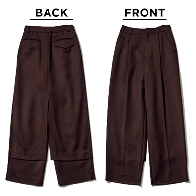 ハリのあるウール生地で仕立てられた、スカートのようなパンツ。きちんと感をキープしつつ、スリット入りで足さばきも良好。動きが出るたびに表情を変える、「ただのパンツ」では満足できない人のためのデザイン。スカート部分にはスリット入りで動きやすい。