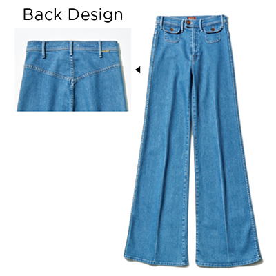 ひざ下を長く見せるフレアシルエットに加え、注目すべきはバックスタイル。計算されたVステッチが視覚効果で小尻を演出。360度どこから見ても美しい、デニム選びの最終結論。