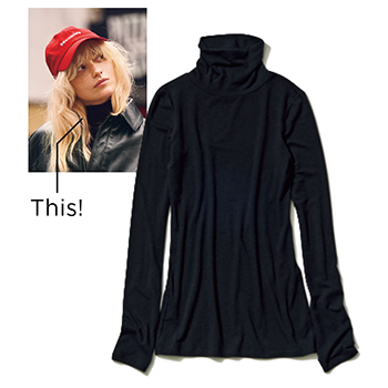 レイヤードに不可欠なタートルネック。ニットのチクチク感が苦手な人にとっての救世主となるのが、伸縮性に優れたとろみ素材のカットソー。肌に吸い付くようななめらかさは、一度着たら手放せない心地よさ。