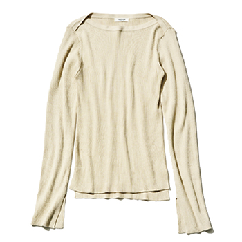 ハイゲージのリブニット。手首を華奢に見せるそで口のスリットや、デコルテを美しく見せるボートネック。シンプルな中に詰め込まれた「女らしさを引き出すギミック」が、着る人を美しく見せる。