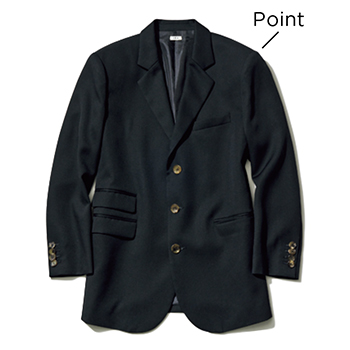 オーバーサイズを単なる「ゆるさ」に見せない秘訣は、肩のラインにあり。パッドが生む直線的なフォルムが、コンサバになりがちな黒ジャケットをモードな表情へと引き上げる。パッドは取り外し可能で、気分に合わせてシルエット調整も自在。