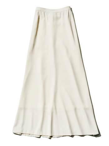 パキッとした白だと浮いてしまう冬の装いには、黄みがかったアイボリーが正解。柔らかくもしっかりと重みを感じる上質な生地が、歩くたびに美しいドレープを生む。透けを気にせず履ける裏地付きも高ポイント。