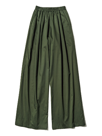 深いグリーンの色みとワイドなシルエットが作る、辛口でハンサムな佇まい。それでいてウエストはゴム仕様という、大人のわがままを叶える1本。楽をしているように見せない、それが「センスのいい人」のルール。