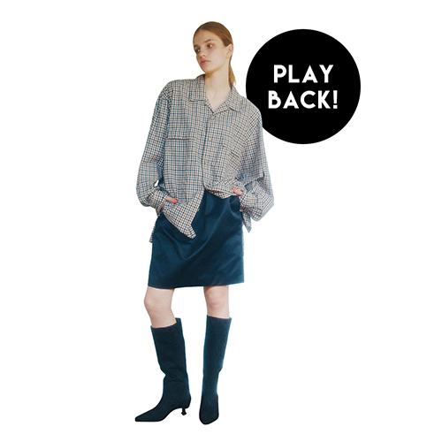 黒シャツジャケット 48,400円/HER. 中に着たネイビーシャツ 33,000円/SLOANE(ザ ショップ スローン 新静岡セノバ店) ブラウンミニスカート 7,150円/KBF(KBF ルミネエスト新宿店) イヤリング 6,600円、ダブルリング 4,860円/ともにアビステ 眼鏡 50,380円/Oliver Peoples(ルックスオティカジャパン カスタマーサービス) バッグ 212,300円/ZANCHETTI(ショールーム ロイト) ロングブーツ 45,000円/バナナ・リパブリック