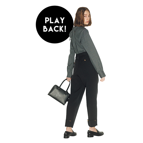 黒ドレープブラウス 27,500円/HER. チャコールパンツ 40,700円/SACRA(インターリブ) バッグ 36,300円/クリスチャン ヴィラ(デミルクス ビームス 新宿) シューズ 63,800円/ブレンテッラ(ビームス ハウス 丸の内)