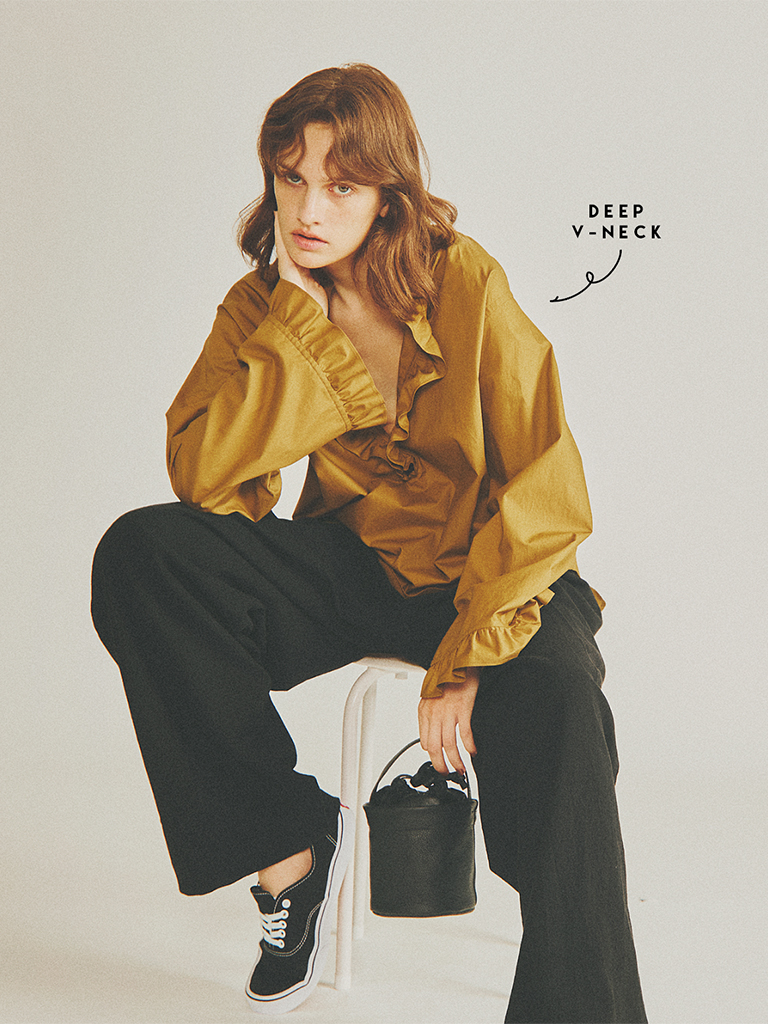 深く開いたVネックとハリのある生地がキレをもたらし、大ぶりなフリルをクールに転換。ボリュームが出すぎず、ワイドパンツとでも見た目はスマート。デコルテの色香と渋色で大人びた甘さへ。パンツもボーイズではなくメンズライクなものを。