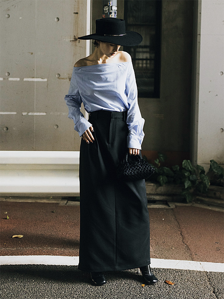 大胆な肌見せでもレディにふるまえる、シャツベースのオフショルダー。コンパクトなシルエットにより適度にフィット感があるため、そでがズレ落ちない。淡いブルーのさわやかな色で、好感度の高さもキープ。ほどよくゆとりがあるIラインスカートを合わせて、力まずスレンダーな見た目へとあと押し。