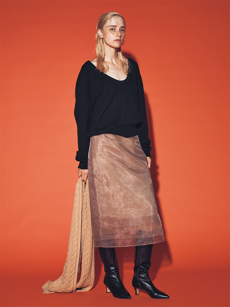 【POINT】上半身の肌感との調和を図る、ほんのりシアーなスカート。ワンツーに奥行きをもたらしつつ、ブーツが見える面積が増えるおかげで、レディなのにフェミニンには転ばない絶妙なバランスに。